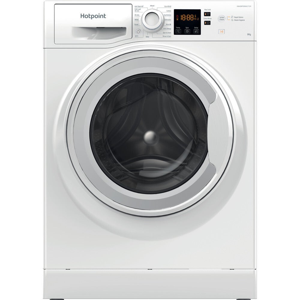 This Hotpoint freestanding front loading Washing Machine features: an extra-spacious, large 8,0kg capacity. A fast, resource-efficient 1600 revolutions per minute spin speed. White colour.