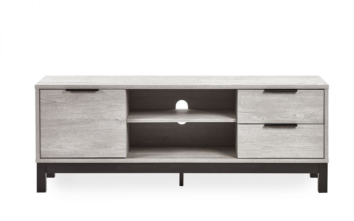 Discover the seamless blend of style and simplicity with the Bali TV Unit in Grey Oak. Crafted using revolutionary click furniture technology, this unit seamlessly combines high-quality craftsmanship with effortless assembly. The modern grey oak finish, complemented by contrasting black legs and handles, brings a classic industrial aesthetic to your living room. Featuring a spacious cupboard and two pull-out drawers for organised storage, along with center shelving for additional storage and display options.