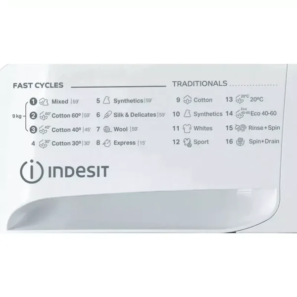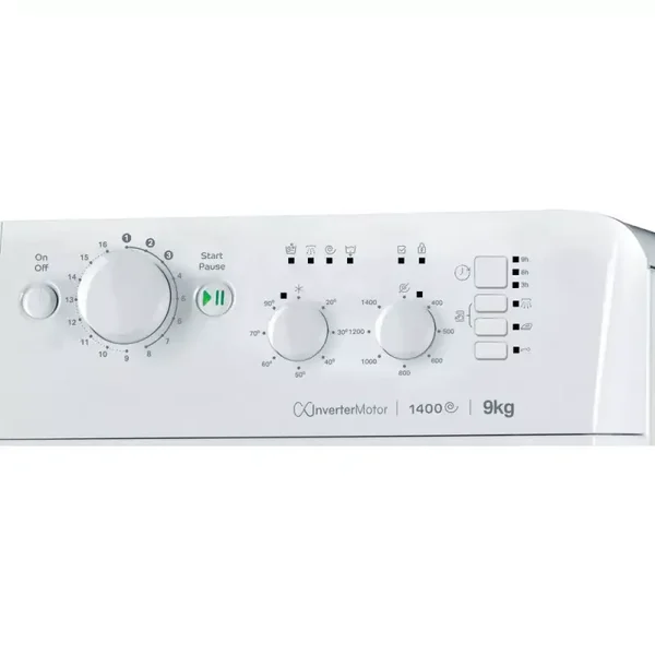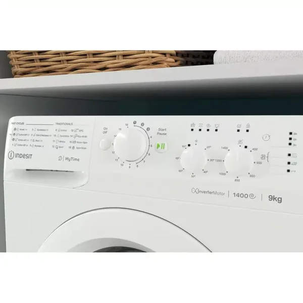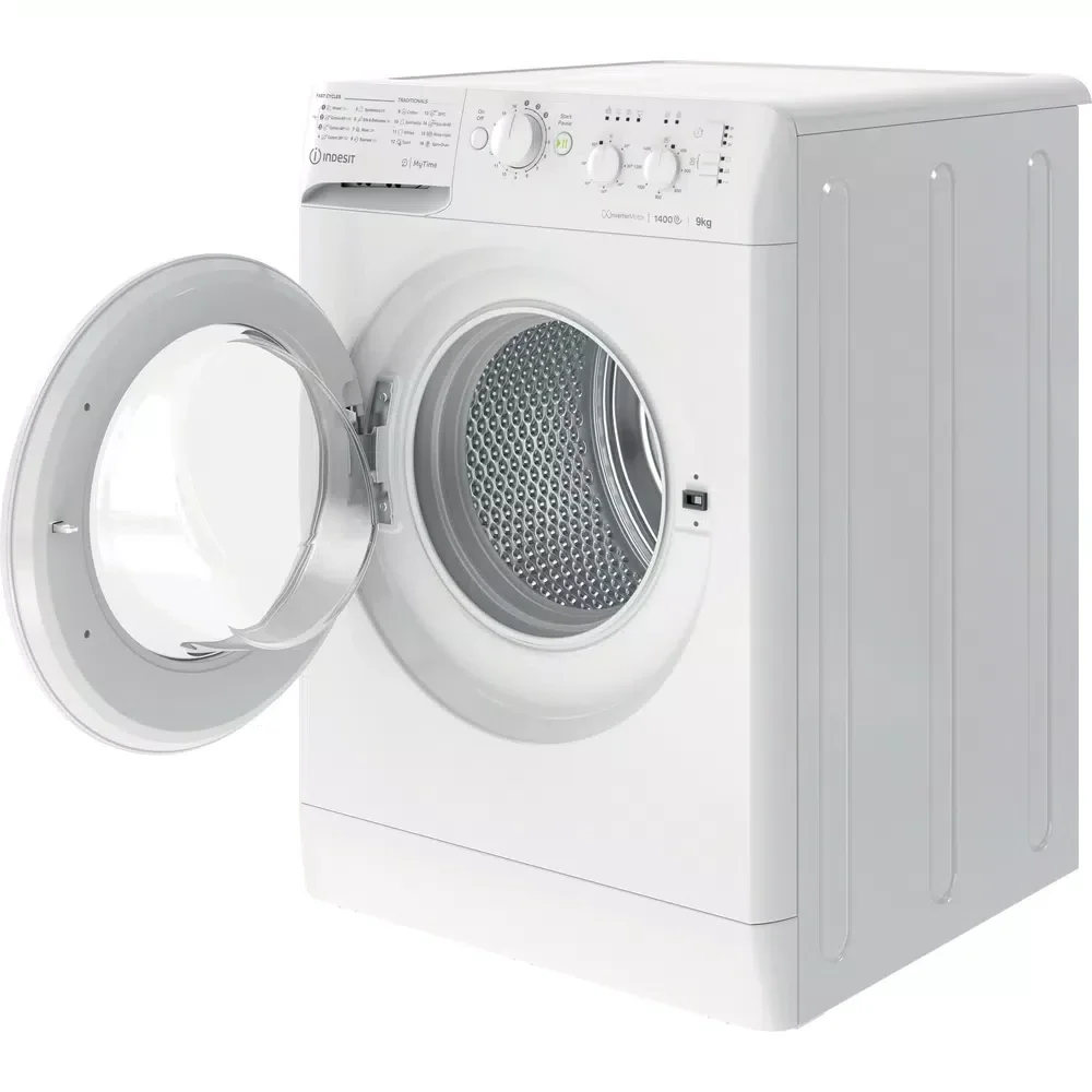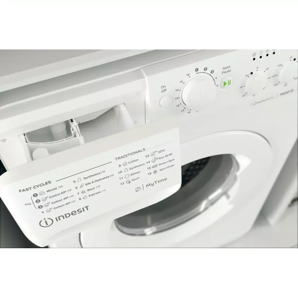 This Indesit freestanding front loading Washing Machine features: a spacious 9,0kg capacity. B energy rating. A fast, resource-efficient 1400 revolutions per minute spin speed. White colour.