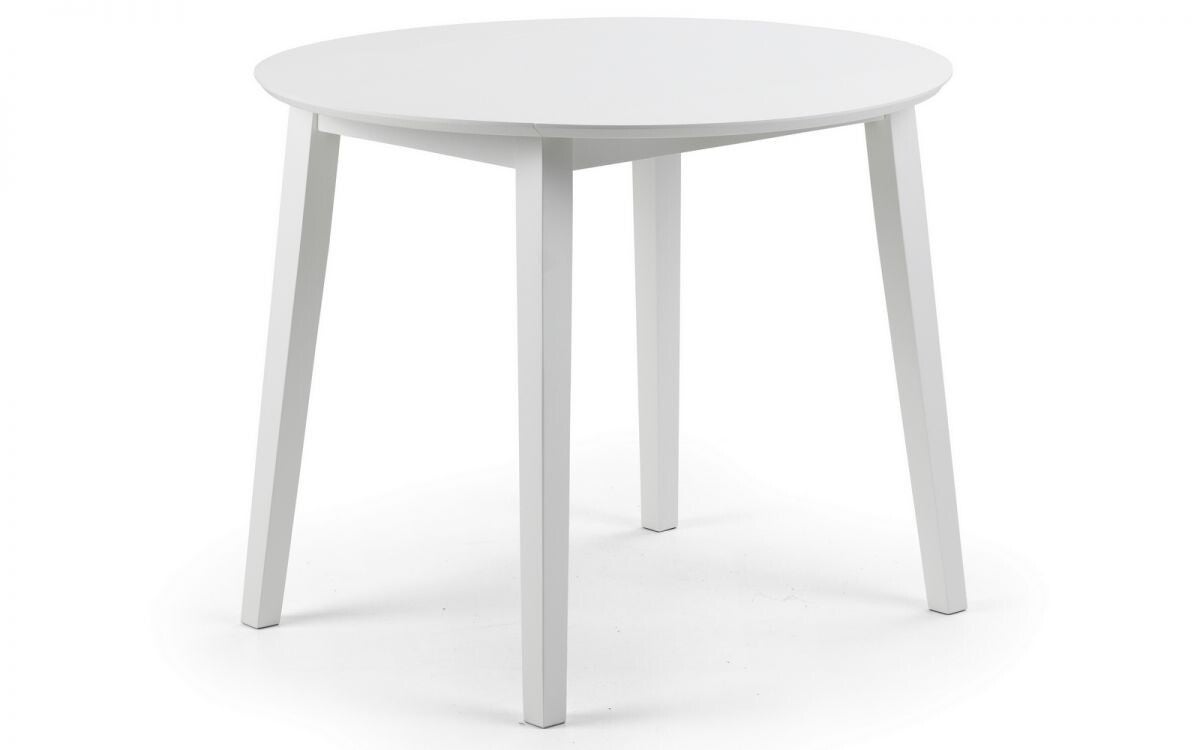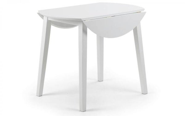 A stylish, double drop leaf round dining set in an immaculate white lacquered finish. Its clean, crisp look fits seamlessly with both traditional and contemporary decor. Featuring high-backed dining chairs with a padded ivory microsuede seat, this dining set is the perfect space saving addition for a smaller room.