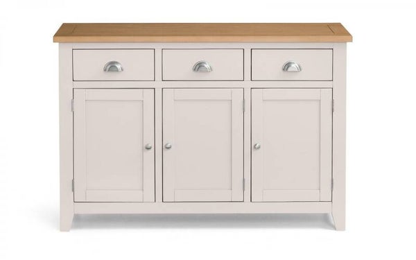 An elegant Sideboard, presented in an immaculate painted, soft Elephant Grey finish with beautiful pale oak top, crafted from a combination of high grade American White Oak solids and veneers. This stylish piece looks beautiful and offers phenomenal storage for kitchen, living or dining room. Includes three practical drawers above a double and single cupboard space, accented with chic cupped handles in a brushed steel finish; ideal for cutlery, crockery and glassware. The combination of superior quality materials and classic design ensures a timeless appeal and fits perfectly alongside both traditional and contemporary decor. Part of the extensive Richmond Dining and Occasional furniture range from Julian Bowen.