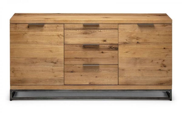 Made from solid oak, this Sideboard offers a rustic finish emphasising the stunning natural wood grain. The Brooklyn Sideboard offers a vintage edge featuring industrial style metal legs. Feautring two spacious cupboards with shelves, and three drawers, this sideboard is perfect for a wide range of modern decor. Part of the Julian Bowen Brooklyn Dining and Occasional Collection.