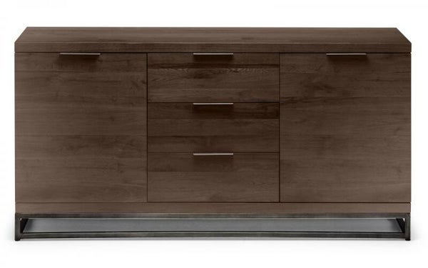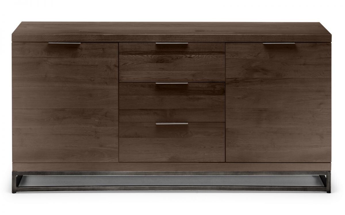 Made from solid oak, this sideboard offers a rustic finish emphasising the stunning dark oak wood grain. The Brooklyn Sideboard offers a vintage edge featuring industrial style metal legs. Feautring two spacious cupboards with shelves, and three drawers, this sideboard is perfect for a wide range of modern decor. Part of the Julian Bowen Brooklyn Dining and Occasional Collection.
