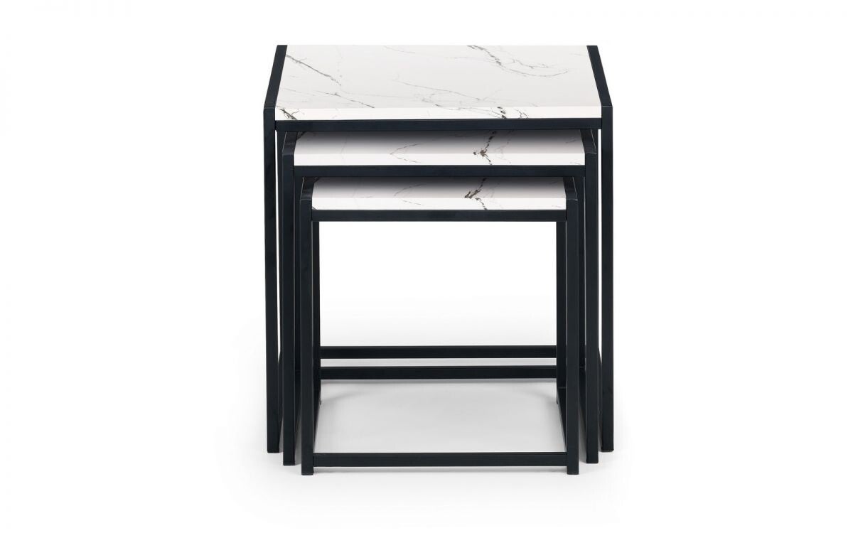 A cool, modern nest of tables designed to add a contemporary touch to any home or work place. Its simple clean lines, delineated by a subtle, black coated metal frame are complemented perfectly by a modern, white marble foil, to create a very stylish and sleek product.