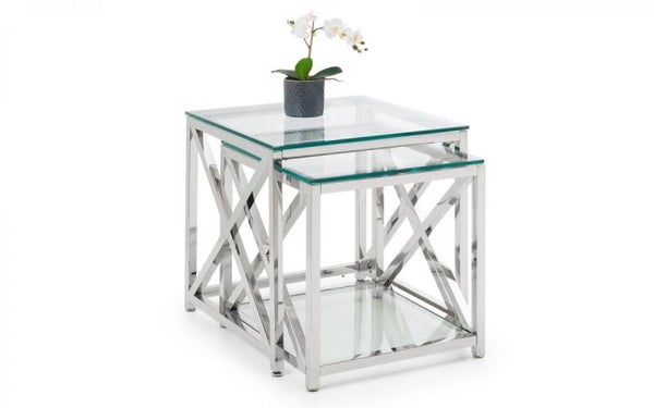 The lavish Miami occasional collection will add a touch of class and luxury to any home. Taking inspiration from the Art Deco period, the Miami features a striking cross frame design. Crafted from a chrome frame and tempered glass, this nest of tables would be a stunning addition to your space.