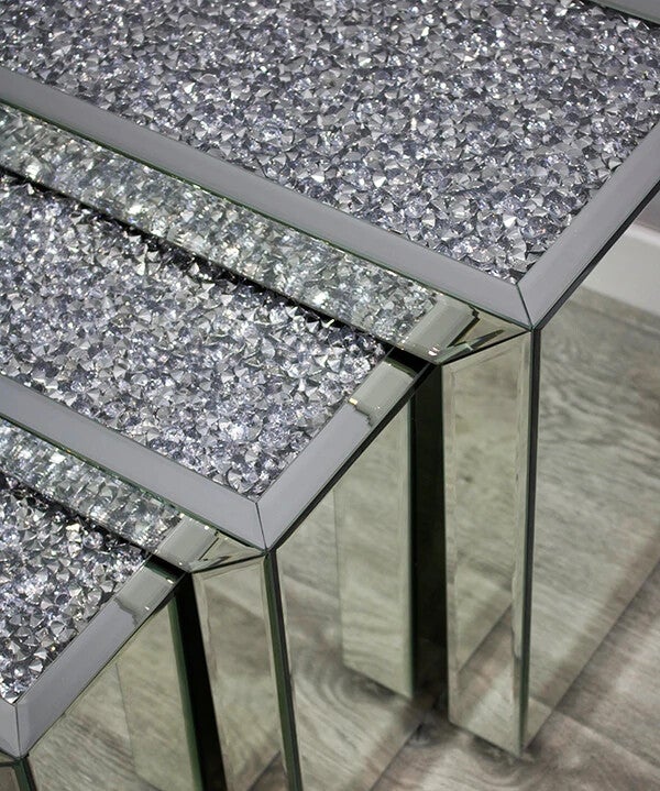 This beautiful Mocka Diamond Crush Nest Of Tables is sure to add a touch of sparkle to your home. If you're looking to add a modern and classy feel to your living room this table is the perfect option for you. Complete with a mirrored exterior and crushed diamond design on each table it will sparkle throughout your home interior.