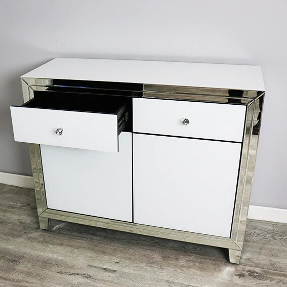 Stunning, simple storage, the Bianco two door storage cabinet is Hollywood-glamour and elegant.