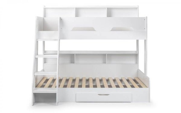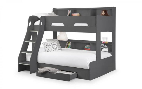 The Orion Triple Bunk is available in a modern Anthracite or White finish. The Orion combines style with great practicality and includes a handy pull-out drawer and extensive shelving for kids' books and toys, with a subtle raised lip to prevent anything slipping down the back. Sleeping up to 3 children, or adults if using for a guest bed, the robust ladder features attractive cut-out handles and optional glow-in-the dark strips on the steps for added safety.
