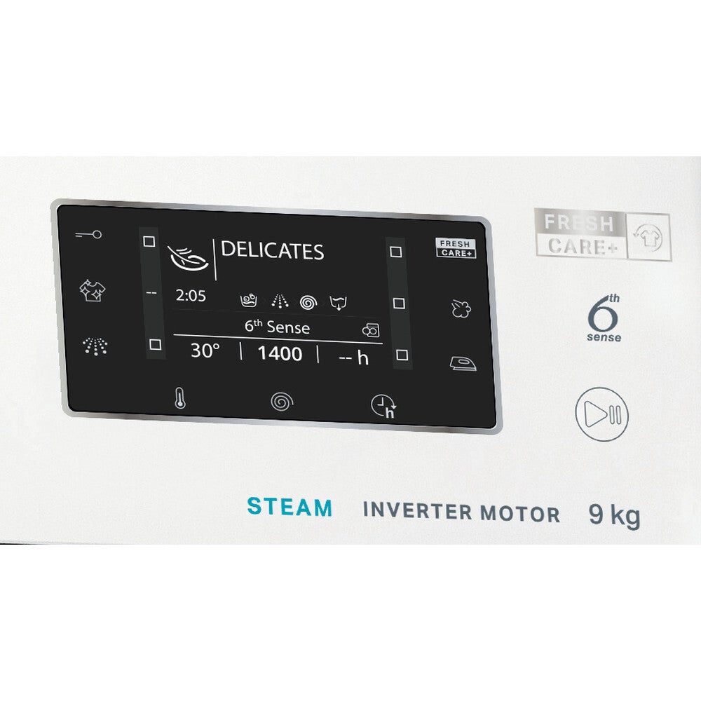 This Whirlpool Washing Machine features: white A spacious, large 9,0kg capacity. Outstanding A energy rating. A fast, resource-efficient 1400 revolutions per minute spin speed. Exclusive 6th SENSE technology, uses sensors within the drum to assess how dirty your laundry is, the cycle is automatically adapted, saving up to 50% on energy, water and time, as well as reducing detergent wastage.