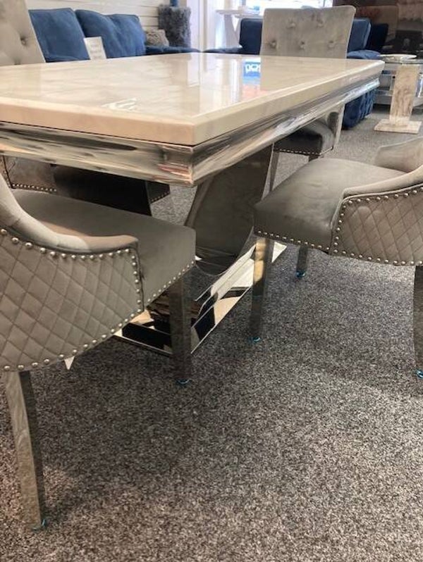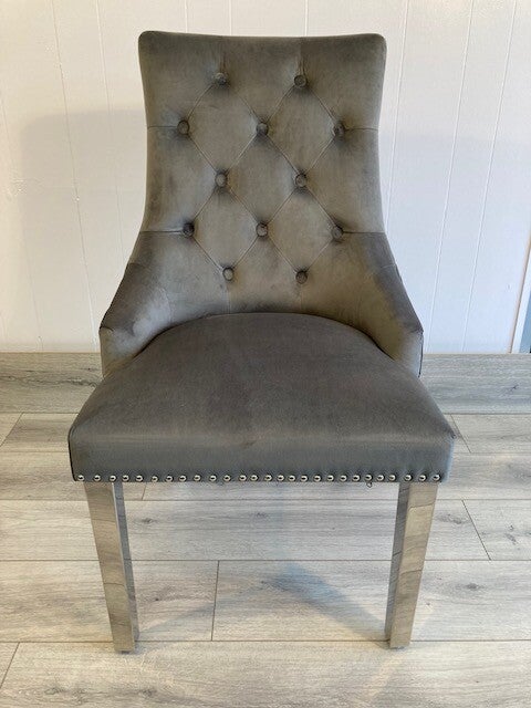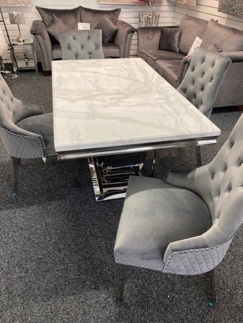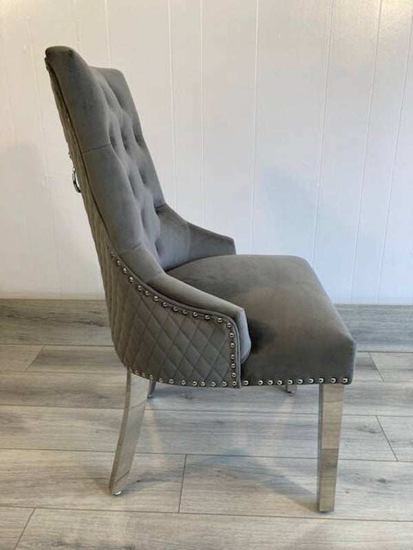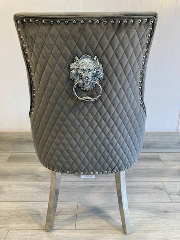 The Majestic dark grey velvet dining chair with its chrome studded trim complimenting the deep velvet buttons and the lion head knocker, a stunning addition for the Arial white marble top dining table.