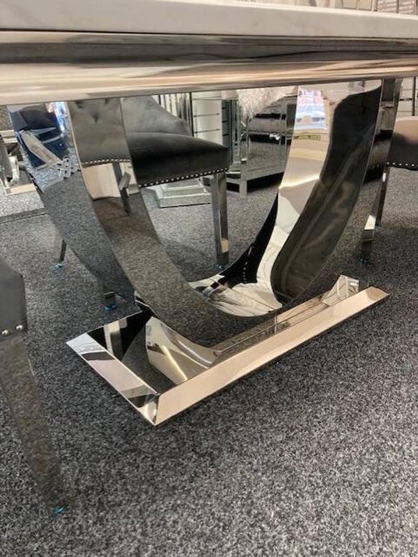 Ultra chic and glamorous, this contemporary dining table redefines high end living. Comprising of a beautiful marble top which is complemented with a polished stainless steel swooping base. Our marble is incredibly hardwearing and scratch resistant. It’s pedestal base is solid and heavy weighing making it extremely sturdy. The sleek lines and smooth materials make the Arial easy to wipe clean and the perfect choice for a busy family.