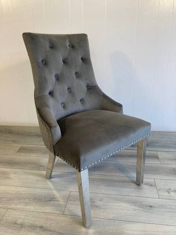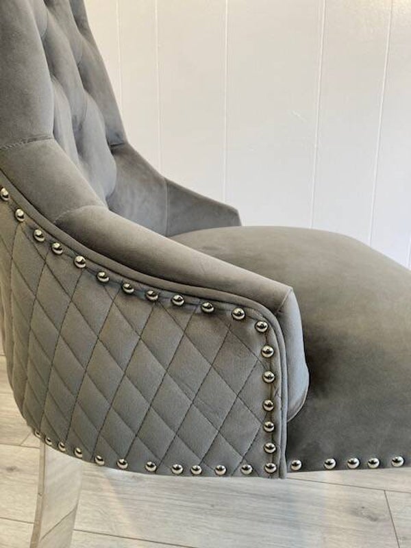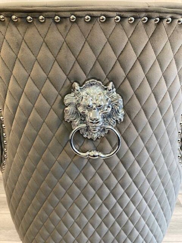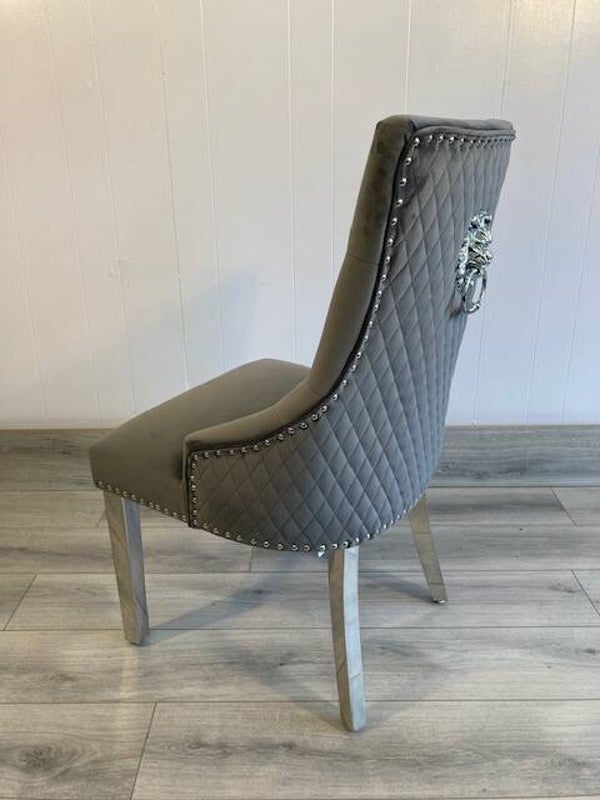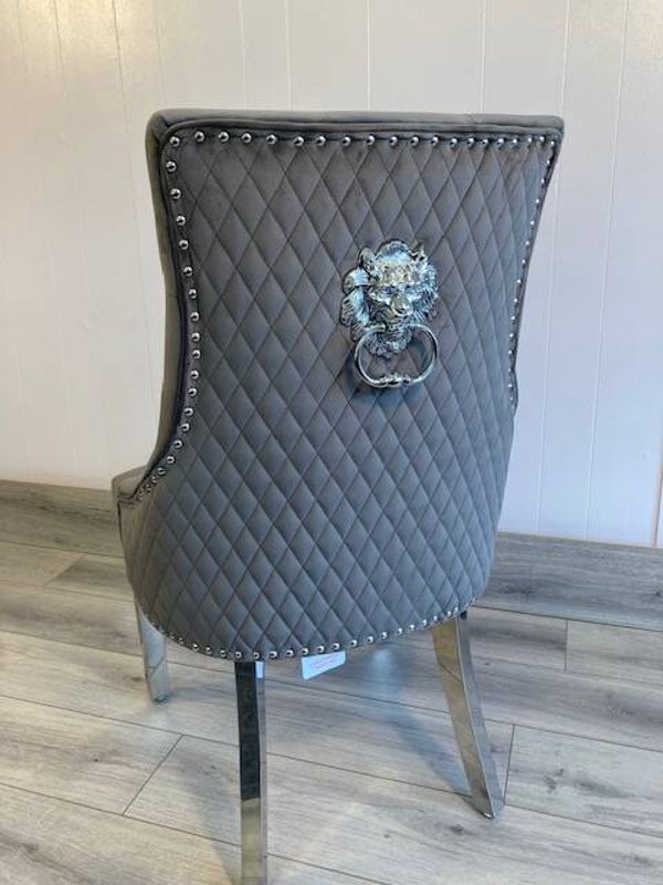 The Majestic dark grey velvet dining chair with its chrome studded trim complimenting the deep velvet buttons and the lion head knocker, will be a stunning addition for any dining table. Solid chrome legs with adjustable feet.