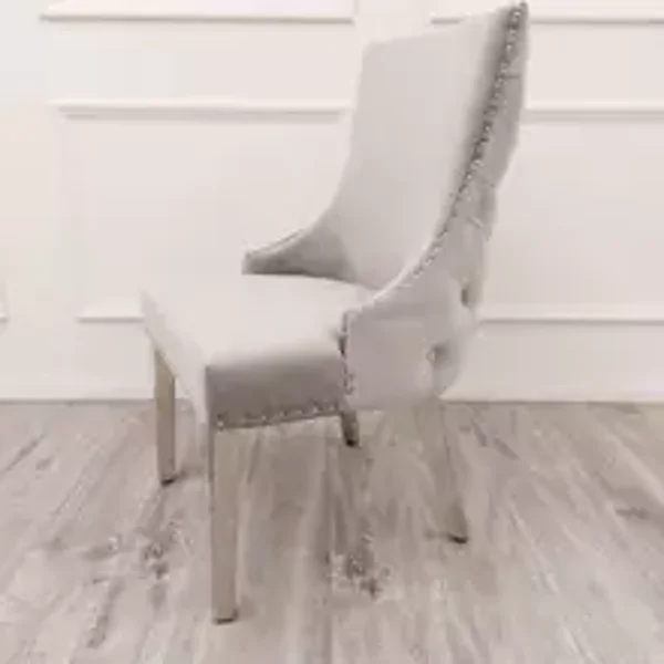 Our Kensington light grey Velvet Dining Chair features Chrome stud detailing, our signature Chrome legs and a super luxurious deep buttoned back.
